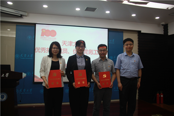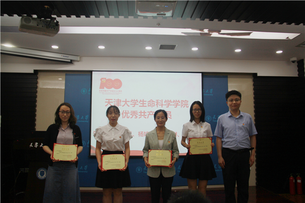 尚洁宣读《中共天津大学生命科学学院委员会关于表彰生命科学学院优秀共产党员、优秀党务工作者的决定》。根据《决定》,学院党委对朱与菁、朱春凤、杨婷婷、张丽琳、宫晓群5位共产党员,卜繁旭、杨柳、武璇、林鋆4位党务工作者予以表彰,分别授予“天津大学生命科学学院优秀共产党员”“天津大学生命科学学院优秀党务工作者”称号。此外,在天津大学“两优一先”评选表彰中,彭鑫、孙万蜜获“天津大学优秀共产党员”荣誉称号,尚洁获“天津大学优秀党务工作者”荣誉称号。党委书记李一昂为上述获奖代表颁发荣誉证书。