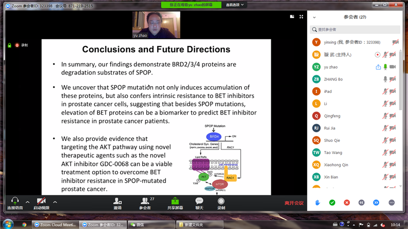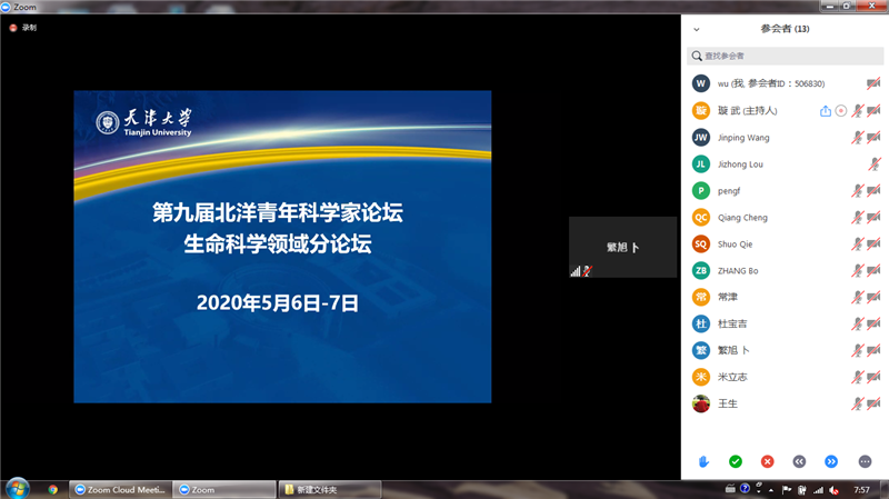 2020年5月6日至7日,第九届北洋青年科学家论坛生命科学领域分论坛通过ZOOM视频会议在云端召开。本次论坛由天津大学生命科学学院举办。来自哈佛大学、耶鲁大学、牛津大学、帝国理工学院等高校和科研机构的19位海内外优秀青年学者应邀参加论坛,针对生命科学领域的国际前沿和热点问题开展交流与研讨。生命科学学院院长叶升,党委副书记李一昂,副院长、微生物与免疫研究所所长黄金海,结构与分子生物学研究所所长米立志,纳米生物医学研究所所长常津,学院青年教师代表参加了本次论坛。论坛还邀请了来自中国科学院生物物理研究所等单位的专家学者担任评委。