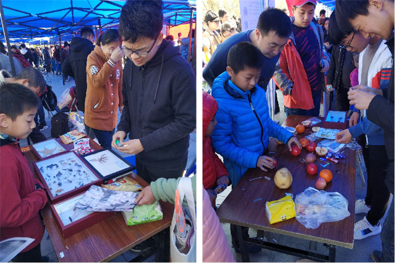 在生命学院科协摊位前,学院展出了海棠花装饰品及部分海洋生物标本,组织与生物知识相关的猜谜游戏、水果电池制作等活动,吸引了众多游客前来互动参与。同学们协助参与者完成游戏,并耐心地讲解专业知识方面,让参与者学有所获,乐在其中。这些多彩的活动引导参与者走进自然科学,为他们展示了宏观世界里丰富多彩的生物,吸引了众多游客前来参与,反响十分热烈。