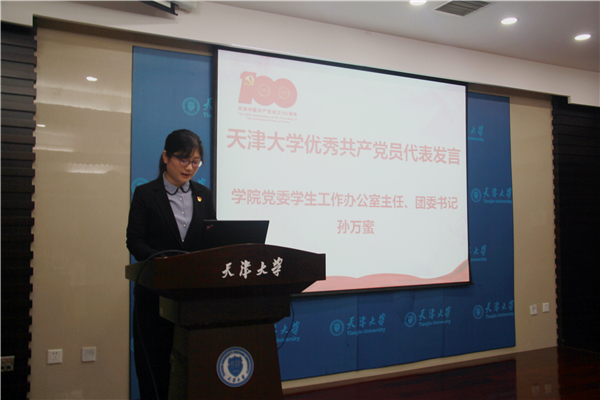 天津大学优秀共产党员代表、生命科学学院党委学生工作办公室主任、团委书记孙万蜜,天津大学生命科学学院优秀党务工作者代表、博士生党支部书记林鋆作交流发言。