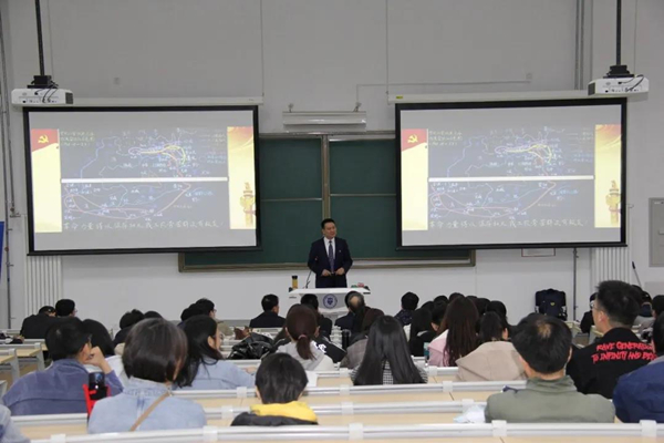 程斯宇老师以激情澎湃、酣畅淋漓的授课风格,生动详实地展现了中国共产党领导新民主主义革命时期“四渡赤水、巧渡金沙江”这一惊心动魄、波澜壮阔的历史画卷,带领师生党员进入历史情境,重走“长征路”。程斯宇老师巧妙结合手绘的中央红军“四渡赤水、巧渡金沙江”示意图,以历史发展脉络为主线,将红军机动作战的特长、毛泽东同志高超的军事指挥艺术以及“革命理想高于天”的信念展现得淋漓尽致,充分诠释了“中国共产党为什么能”的重大课题。