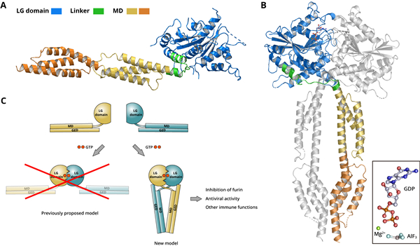 GBP家族成员是干扰素诱导表达的一类重要的先天免疫蛋白,广泛参与宿主对病毒(HIV-1病毒、流感病毒、丙型肝炎病毒和卡波西氏肉瘤病毒等),细菌(结核分枝杆菌、团菌以及福式志贺菌)以及原生动物(弓形虫)的免疫反应。此外,GBP家族蛋白还参与炎症信号通路的调控,是免疫系统的“枢纽”。因此,揭示GBP家族蛋白被信号激活的分子机制,对深入认知免疫系统的工作机理以及开发新型抗感染治疗手段显得尤为重要。