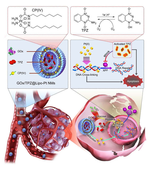 (1)构建了一种缺氧扩增DNA修复-抑制脂质体纳米药物(简称为HYDRI NM),该药物由铂(IV)前药作为构建基元,葡萄糖氧化酶(GOx)和缺氧激活的替拉帕明(TPZ)的作为有效载荷配制而成。