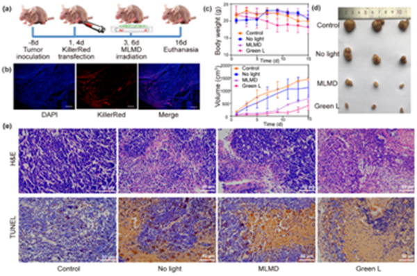 (2)非植入式“磁-力发光”微器件刺激表达有光遗传蛋白(KillerRed)的肿瘤细胞产生大量活性氧,用于抑制皮下肿瘤的生长。
